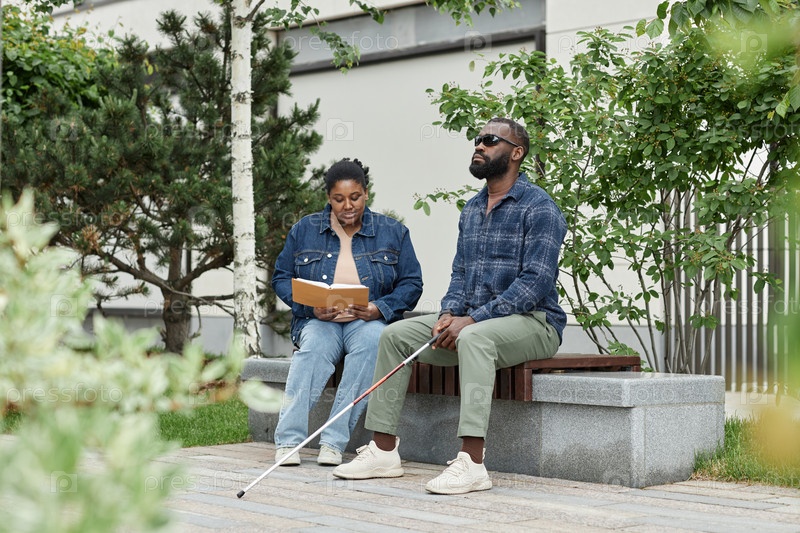 Женщина читает книгу слепому партнеру в парке