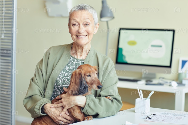 Улыбающаяся старшая женщина с собакой в ветеринарной клинике