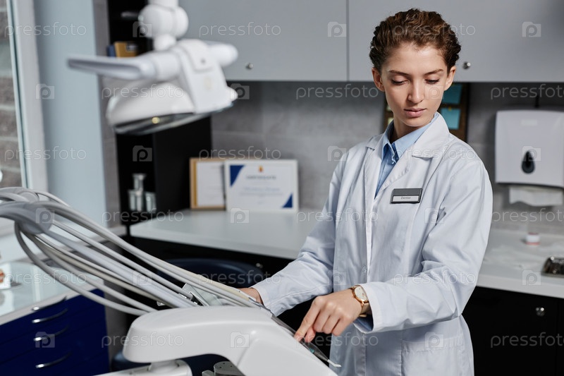 Молодая женщина-стоматолог устанавливает оборудование в современной стоматологической клинике