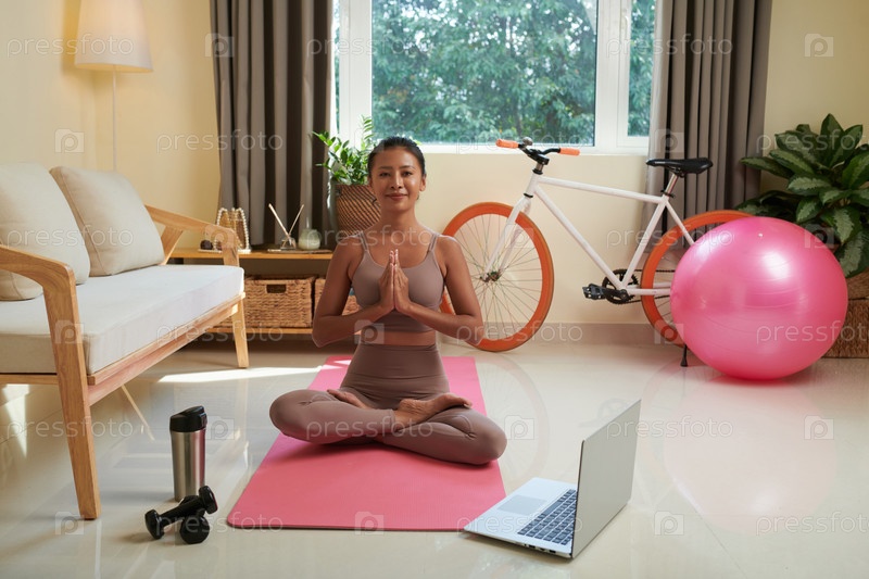 Улыбающаяся женщина медитирует дома