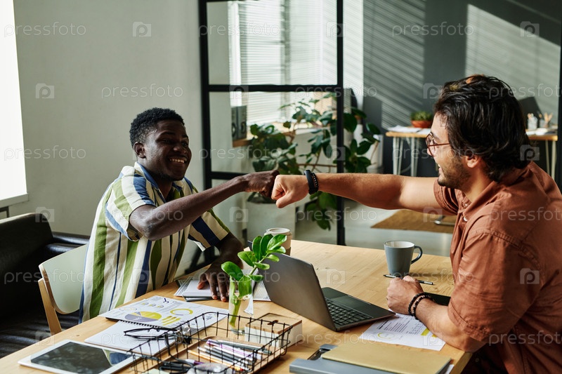Две счастливые молодые межкультурные коллеги, делающие ударный удар