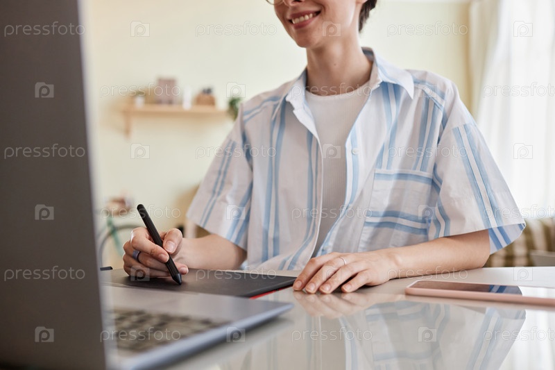 Молодая женщина использует ручку-таблет для цифрового дизайна