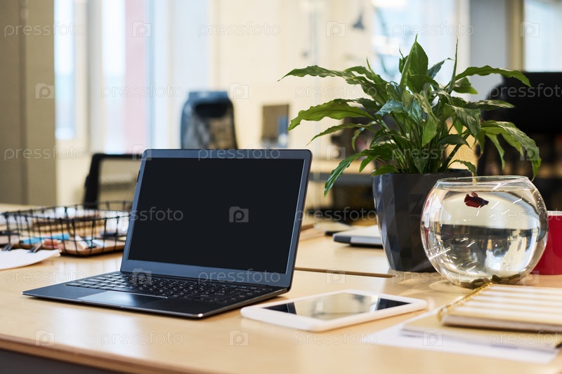 Ноутбук, окруженный группой предметов, стоящих на рабочем месте