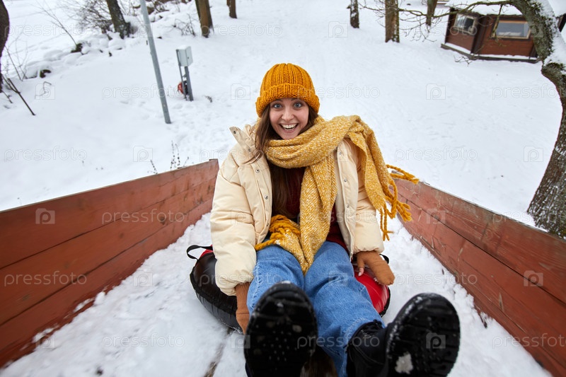 Молодая женщина на санках спускается вниз по склону