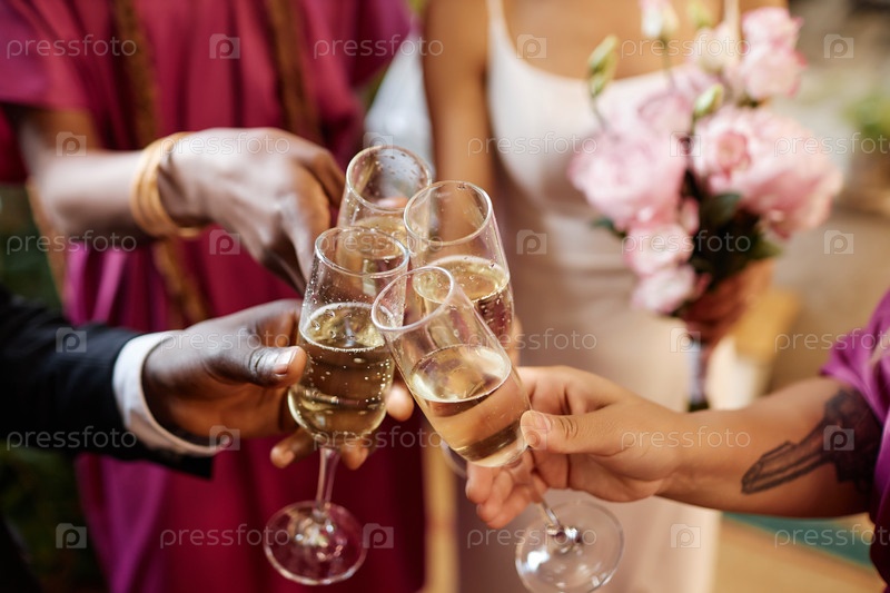 Тост в бокалах с шампанским во время свадебного приема