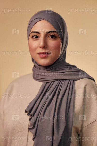 Молодая красивая мусульманка в сером платке и бежевом пуловере