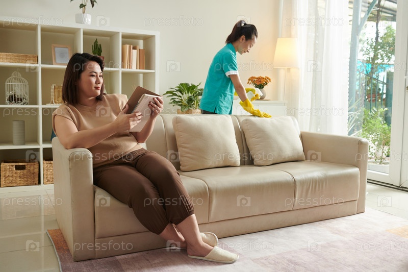 Женщина, использующая услуги уборки для очистки квартиры