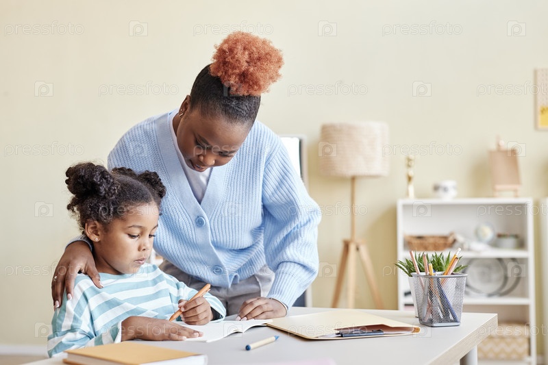 Заботливая мать помогает маленькой черной девочке учиться дома