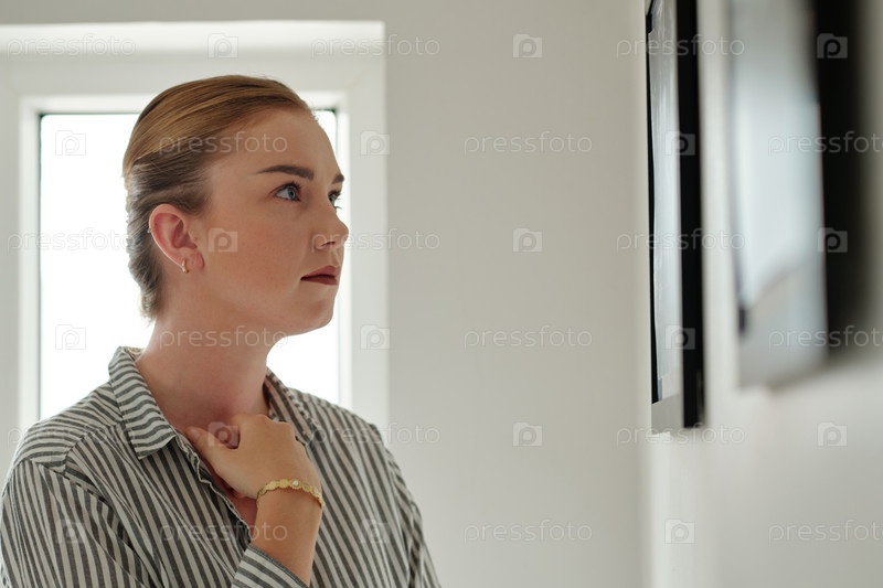 Молодая серьезная блондинка стоит перед стеной с фотографиями