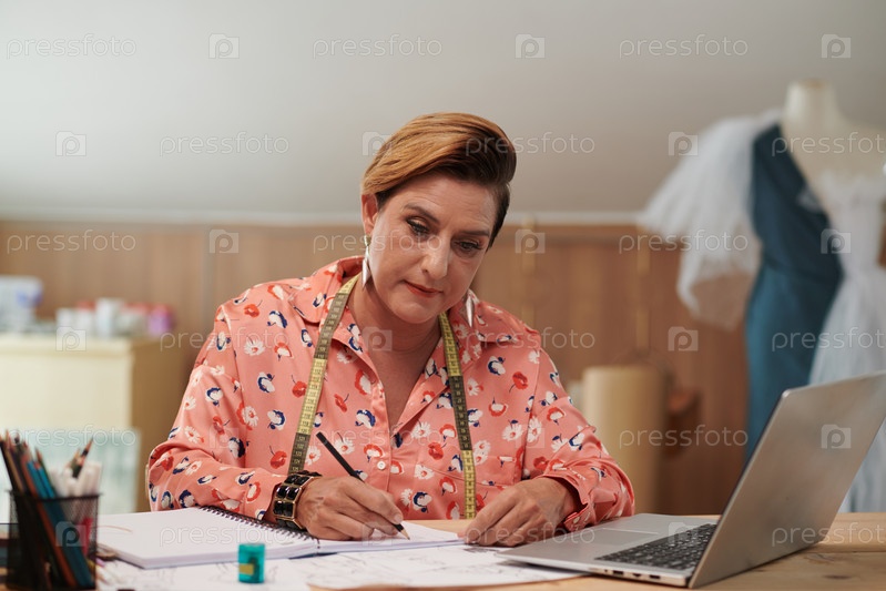 Креативная зрелая женщина рисует эскизы свадебного платья для клиента