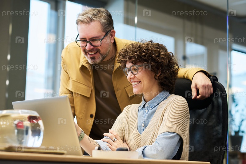 Два счастливых коллеги обсуждают онлайн-данные на экране ноутбука