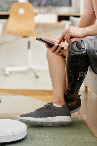 Ближайшее изображение неузнаваемого мужчины с протезированной ногой, работающего в беспроводном вакууме