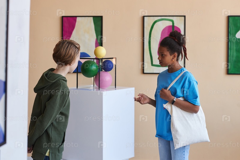 Подростки смотрят на абстрактную скульптуру в галерее современного искусства