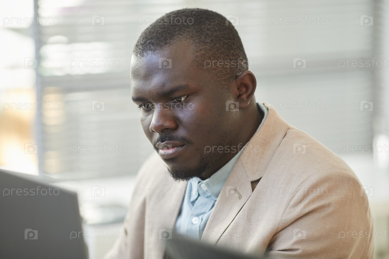 Ближайший снимок чернокожего мужчины, смотрящего на компьютерный экран во время работы в офисном кабинете