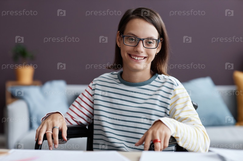 Девушка-подросток с инвалидностью носит очки и улыбается перед камерой