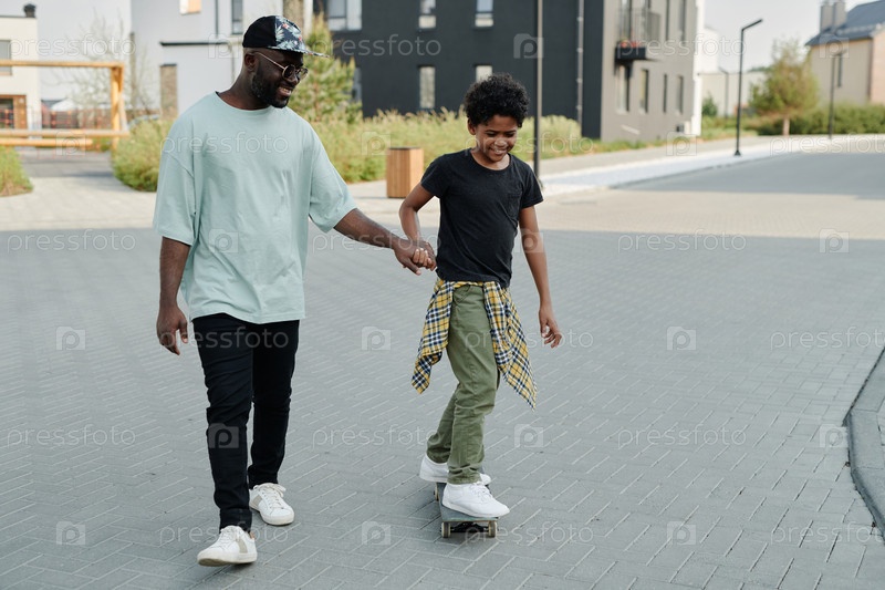 Отец учит сына кататься на скейтборде