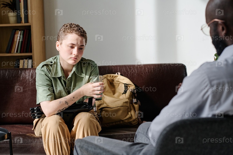 Печальная женщина разговаривает с психотерапевтом