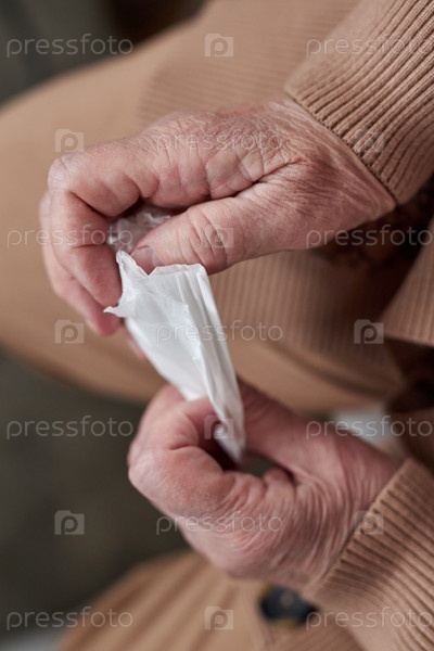 Пожилая женщина держит салфетку и плачет во время сеанса терапии