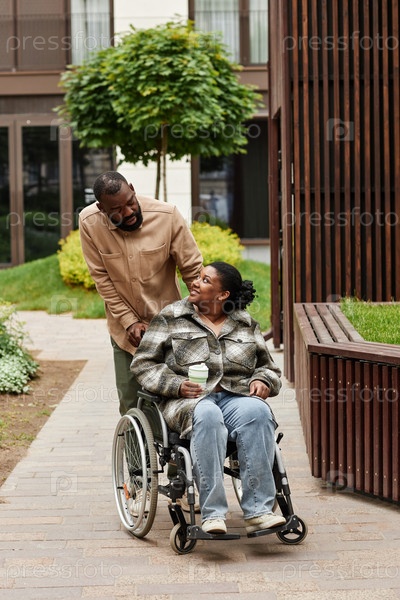 Улыбающийся мужчина помогает жене в инвалидной коляске на открытом воздухе