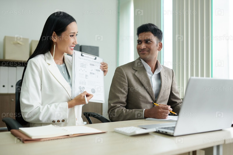 Деловая женщина показывает отчет коллегам