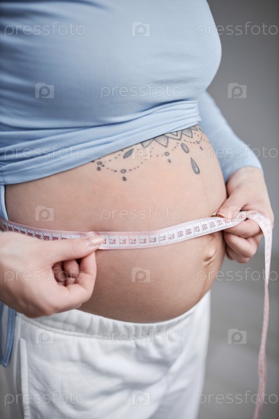 Беременная молодая женщина измеряет живот лентой