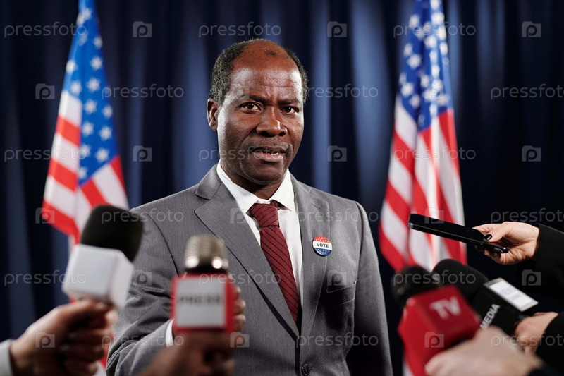 Зрелый афроамериканский депутат в формальной одежде, говорящий на микрофонах