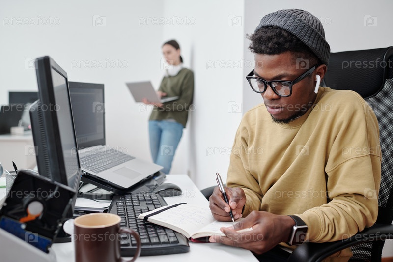 Серьезный афроамериканский парень в очках и повседневной одежде, делающий заметки