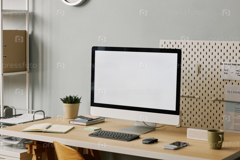 Пустой компьютерный экран на минимальном домашнем офисном рабочем месте, установленном под углом