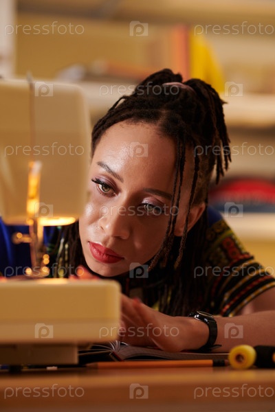 Женщина, проверяющая сломанную швейную машину
