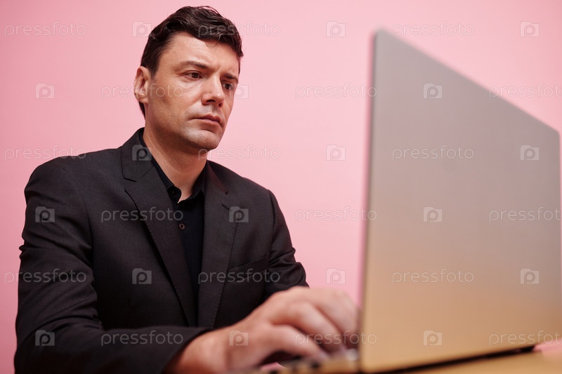 Нахмурившийся бизнесмен отвечает на электронные письма