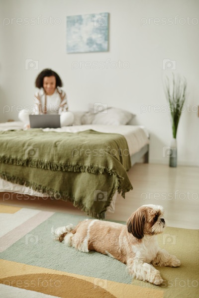 Широкоугольный взгляд на милую собаку ших-цу в уютном доме