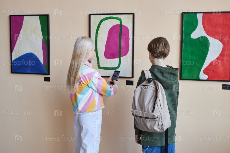 Обратный взгляд на двух подростков, смотрящих на абстрактное искусство в художественной галерее
