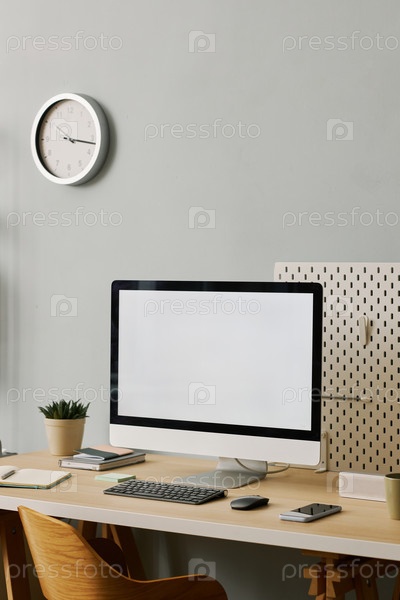 Вертикальная минимальная конфигурация офиса с макетом экрана компьютера на столе