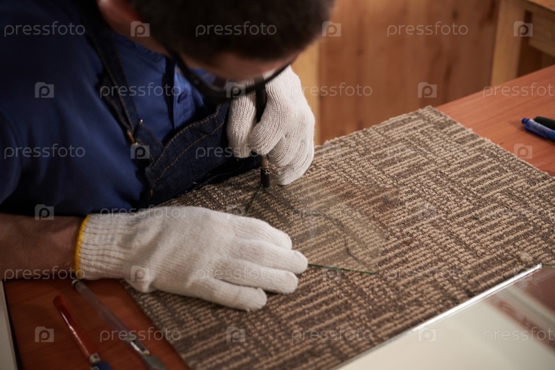 Ремесленник режет стекло на рабочем столе