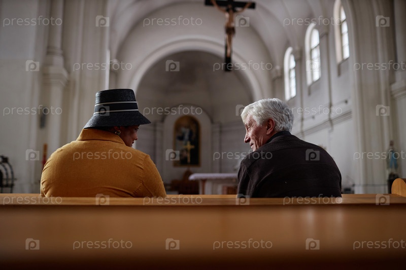 Пожилые люди сидят в старой церкви