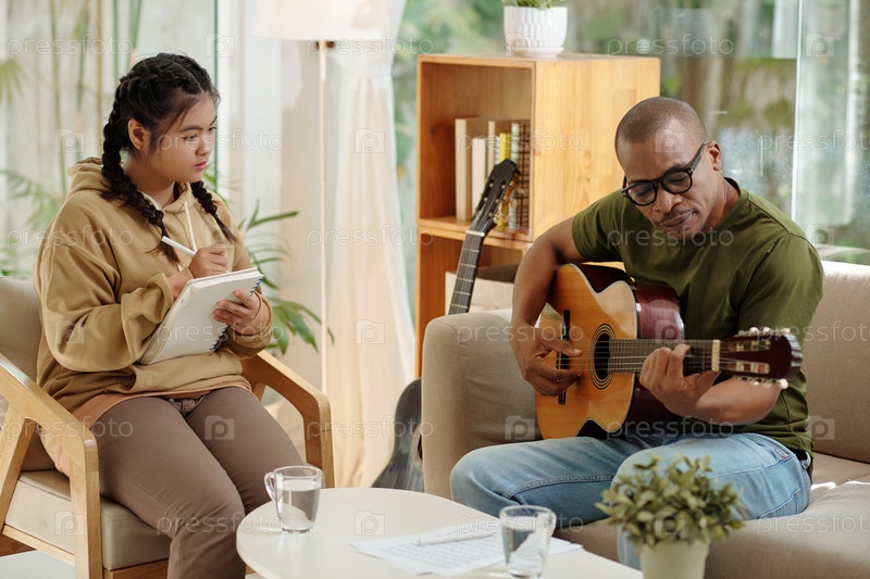 Девушка смотрит, как ее учитель играет на гитаре