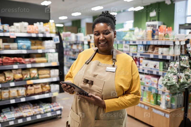 Улыбающаяся чернокожая женщина работает в супермаркете и весело смотрит на камеру