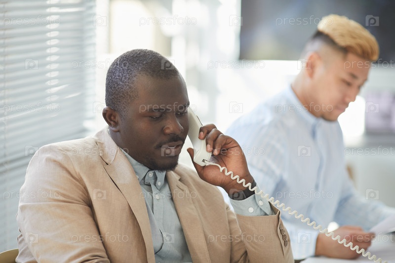 Чернокожий мужчина разговаривает по телефону, консультируя клиента в колл-центре