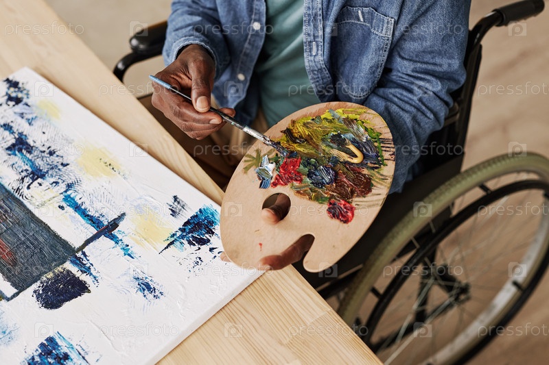 Сверху вид молодого чернокожего мужчины с инвалидностью, смешивающего краски