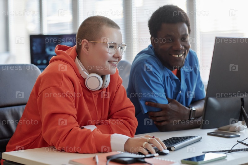 Два счастливых молодых инженера по межкультурной кибербезопасности, сидящих на рабочем месте