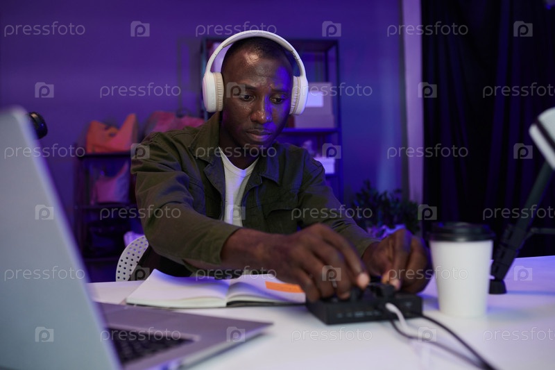 Подкастер, устанавливающий аудиооборудование