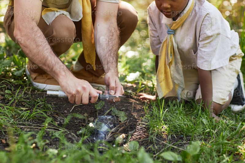 Ближайшее изображение взрослого лидера скаутов, который подключает маленького мальчика к технологии и начинает костер