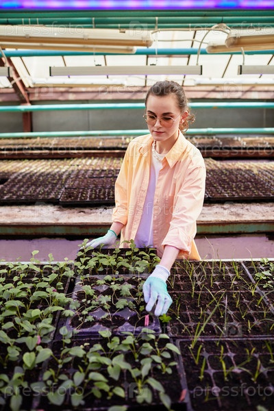 Молодая серьёзная садовница стоит перед стоянкой с растущими побегами