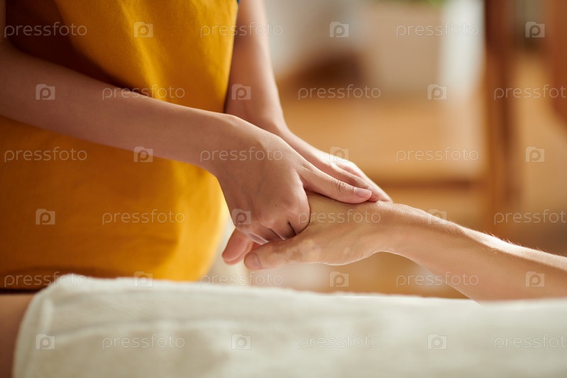 Массажист массует руки женщины