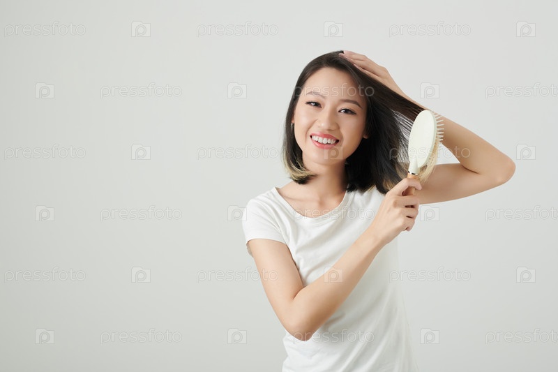 Улыбающаяся женщина чистит волосы