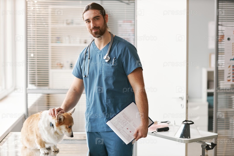 Молодой уверенный ветеринар в синей форме стоит на рабочем месте