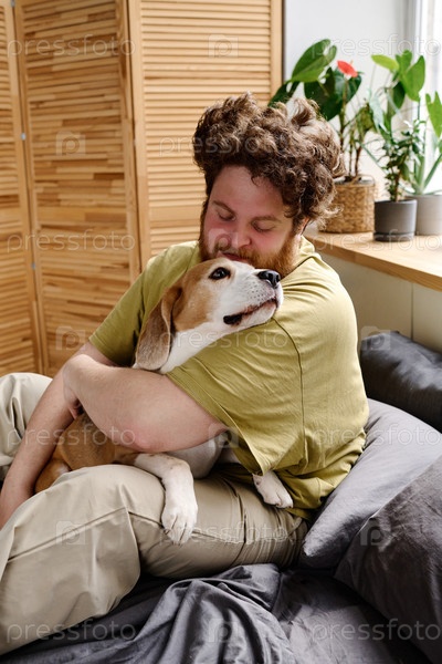 Мужчина обнимает свою собаку на кровати