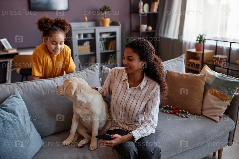 Сцена образа жизни счастливой черной семьи с щенком лабрадора