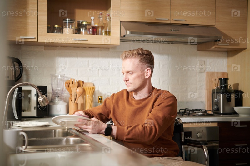 Мужчина с инвалидностью моет посуду