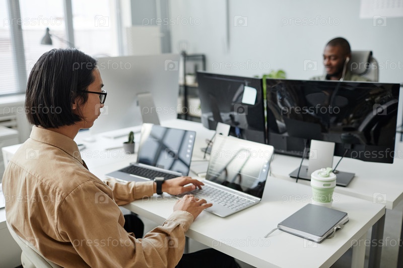 Молодой азиатский программист смотрит на декодированные данные на экране ноутбука во время работы